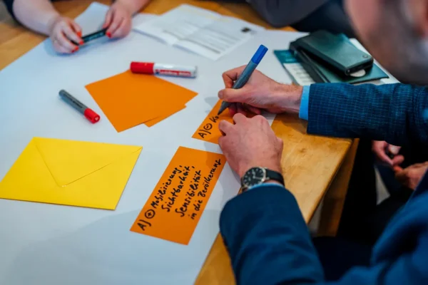 In der Gruppe Zivilgesellschaft berieten die Teilnehmenden derweil darüber, wie sie mit einer bereits bestätigten Vermietung umgehen sollen, nachdem sich herausgestellt hatte, dass die Mie­ter*in­nen einer reichsbürgernahen Organisa­tion angehörten. Auch in den Gruppen Kunstfreiheit und Neutralität wurde diskutiert: Ein*e Künstler*in hatte bei einem Auftritt im Kulturzentrum in einem Song einer AfD-Politikerin Gewalt angedroht und eine lokale Initiative, die den jährlichen CSD organisiert, hatte das soziokulturelle Zentrum um eine Trägerschaft gebeten, um den Fortbestand des CSD zu sichern.
